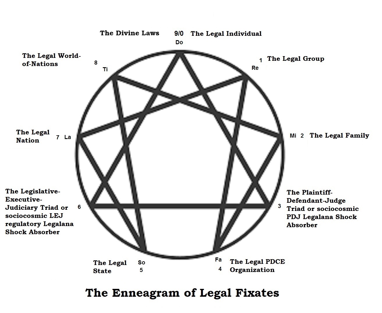 H. MAN-MADE LAWS: THE LAWS OBEY THE TRIAD AND THE OCTAVE LAWS (Revised June 19, 2021) "Laws are made in large numbers by the 1st generation so that the 3rd generation would have something to smash into pieces!" "The man-made laws obey the (ontological and/or "Divine") law of three and the law of seven, and can be sociocosmically fixated into the Enneagram of the Legal Fixates with two lateral triads - a lower lateral Plaintiff-Defendant Triad or sociocosmic PDJ Legalana Shock Absorber at the Mi-Fa Interval (Point 3) and a higher Legislative-Executive-Judiciary Triad or sociocosmic LEJ Regulatory Legalana Shock Absorber at the "So-La Interval" (Point 6) and the Divine laws at the Ti-Do Interval."